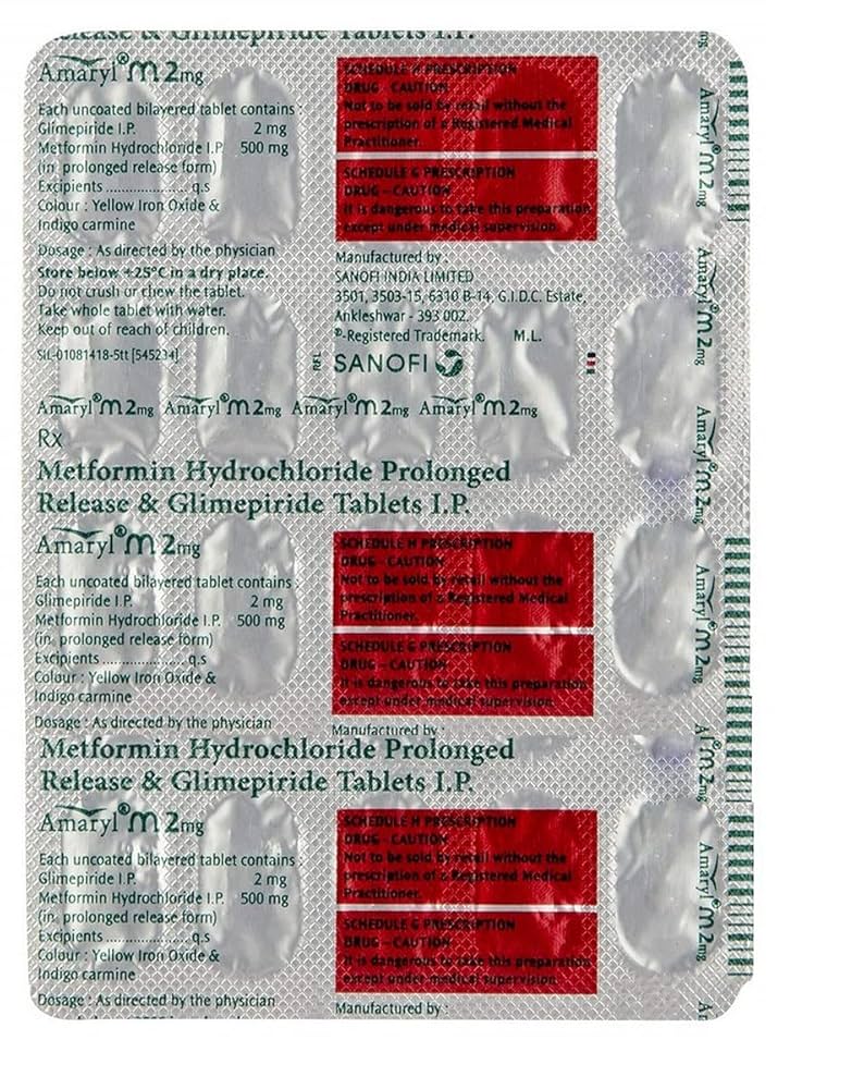 Amaryl M 2mg Tablet PR is used to manage type 2 diabetes mellitus. It combines Glimepiride, which stimulates insulin release, and Metformin, which reduces glucose production in the liver and improves insulin sensitivity. This combination helps maintain healthy blood sugar levels.