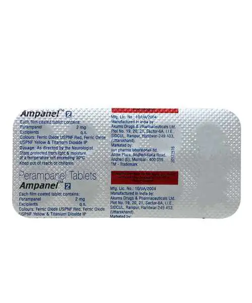 Ampanel 2 Tablet is a prescription medicine manufactured by Sun Pharmaceutical Industries Ltd. It contains Perampanel (2mg), an anticonvulsant that works by selectively blocking AMPA receptors in the brain, which are involved in seizure activity.