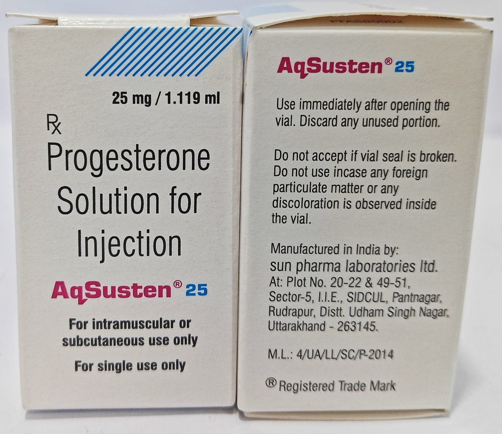 Aqsusten 25 Solution for Injection is a prescription medicine manufactured by Sun Pharmaceutical Industries Ltd. It contains natural micronized Progesterone (25mg), a hormone that plays a crucial role in regulating the menstrual cycle and supporting pregnancy.
