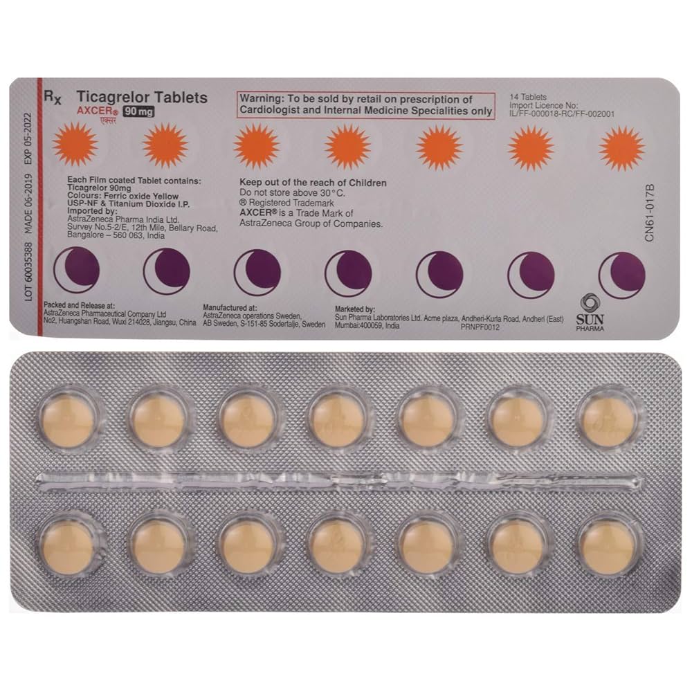Axcer 90mg Tablet is a prescription medicine manufactured by Sun Pharmaceutical Industries Ltd. It contains Ticagrelor (90mg), an antiplatelet agent that works by preventing platelets in the blood from clumping together, reducing the risk of clot formation.
