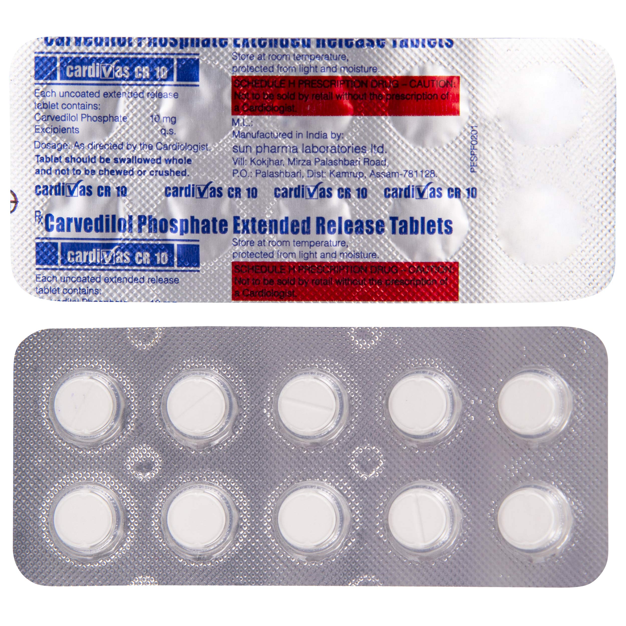 Cardivas CR 10 Tablet is a prescription medicine manufactured by Sun Pharmaceutical Industries Ltd. It contains Carvedilol (10mg) in a controlled-release (CR) formulation, which allows the medication to be released gradually for longer-lasting effects.