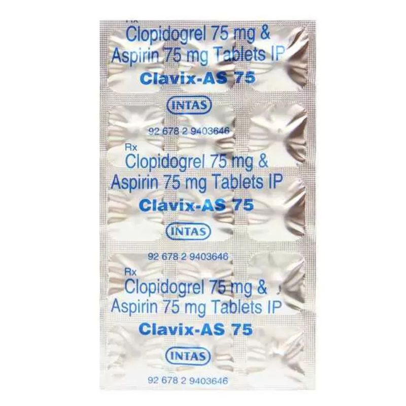 Clavix-AS 75 Tablet is a dual antiplatelet medicine containing Aspirin and Clopidogrel. It is used to prevent blood clots in patients at high risk of heart attack, stroke, or other cardiovascular events, especially after stent placement or heart procedures. Aspirin inhibits platelet aggregation, while Clopidogrel prevents platelets from sticking together, providing enhanced protection against clot formation.