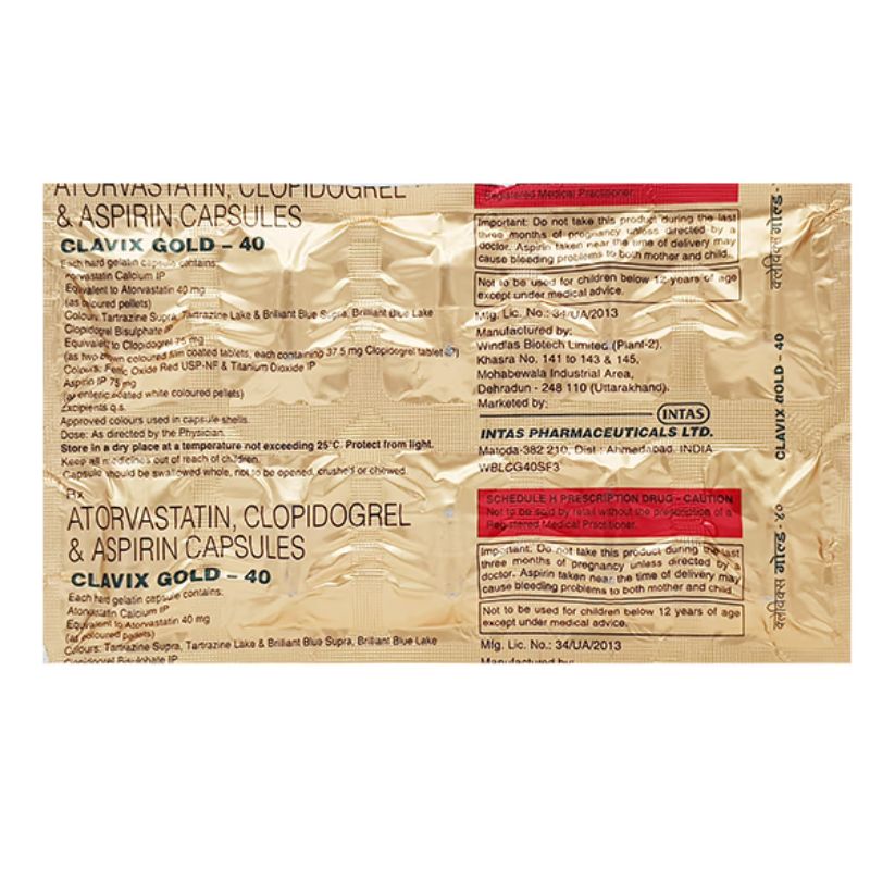 Clavix Gold 75mg/40mg/75mg Capsule is a triple combination medicine containing Aspirin, Clopidogrel, and Atorvastatin. It is used to prevent blood clots and manage cholesterol levels in patients at high risk of heart attack, stroke, or other cardiovascular events. Aspirin and Clopidogrel act as antiplatelets to prevent clot formation, while Atorvastatin helps lower LDL cholesterol and triglycerides, providing comprehensive cardiovascular protection.