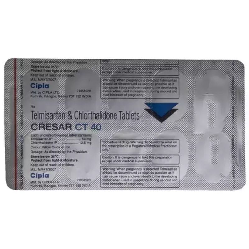 Cresar CT 40 Tablet is a combination medicine containing Telmisartan (an angiotensin II receptor blocker) and Chlorthalidone (a thiazide-like diuretic). It is used to treat high blood pressure (hypertension) and reduce cardiovascular risk. Telmisartan relaxes blood vessels, while Chlorthalidone removes excess fluid, providing effective blood pressure control and lowering the risk of heart attack, stroke, and kidney complications.