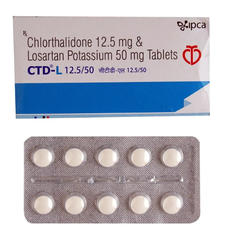 CTD-L 12.5/50 Tablet is a combination of Losartan, an angiotensin II receptor blocker (ARB), and Chlorthalidone, a thiazide-like diuretic. It is primarily used to treat high blood pressure (hypertension) and reduce fluid retention (edema). This combination works by relaxing blood vessels and removing excess fluid from the body, helping to lower blood pressure and reduce the risk of heart attack, stroke, and kidney complications.