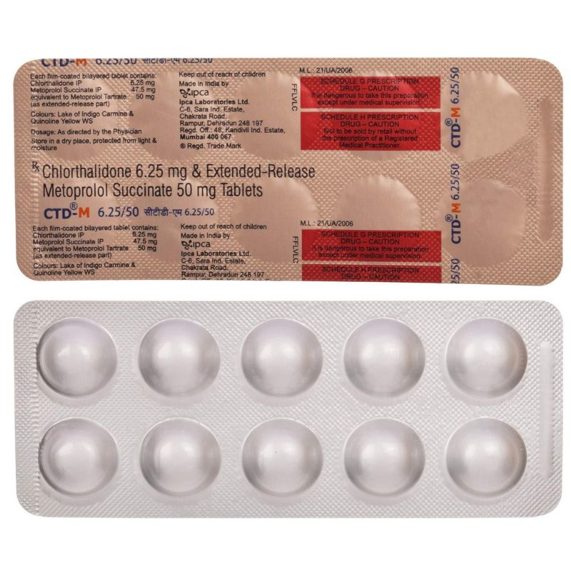 CTD-M 6.25/50 Tablet ER is a combination of Metoprolol Succinate, a beta-blocker, and Chlorthalidone, a thiazide-like diuretic. It is used to treat high blood pressure (hypertension) and manage fluid retention (edema). Metoprolol works by slowing the heart rate and reducing the heart’s workload, while Chlorthalidone helps remove excess fluid, together providing effective blood pressure control and reducing the risk of heart attack, stroke, and heart-related complications.