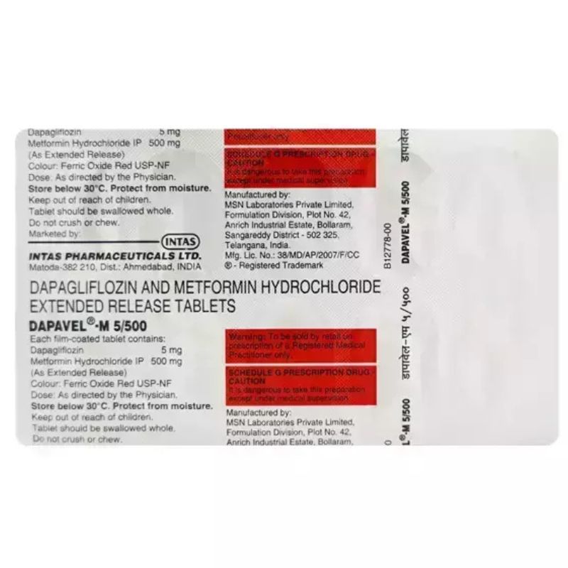 Dapavel-M 5/500 Tablet is an oral anti-diabetic combination medicine used to manage Type 2 Diabetes Mellitus in adults. It contains Dapagliflozin and Metformin, two complementary drugs that work together to provide better control over blood glucose levels.