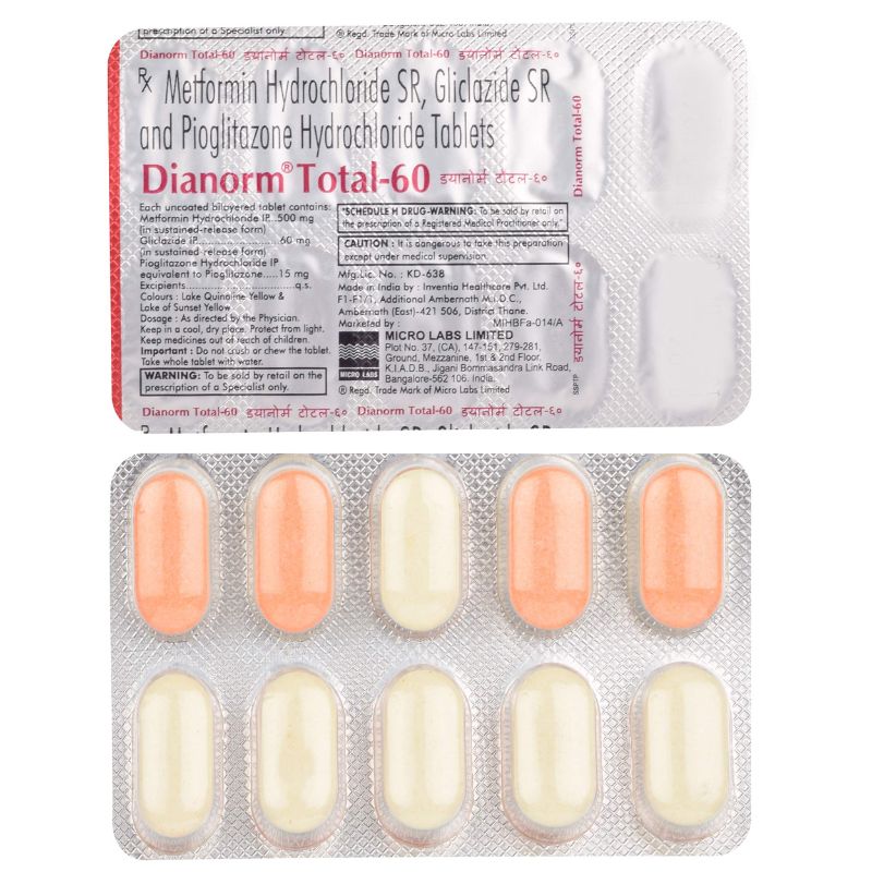 Dianorm Total 60 Tablet SR is a triple-combination antidiabetic medicine designed for the effective management of Type 2 Diabetes Mellitus in adults. It contains Gliclazide, Pioglitazone, and Metformin, which work together to control blood sugar levels by targeting different mechanisms of glucose regulation.