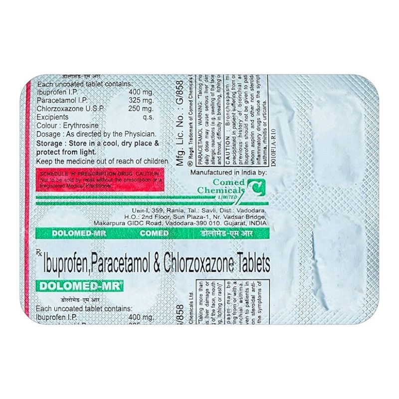 Dolomed MR Tablet is a combination medicine containing Ibuprofen, Paracetamol, and Chlorzoxazone, used for the relief of pain, inflammation, and muscle spasm.