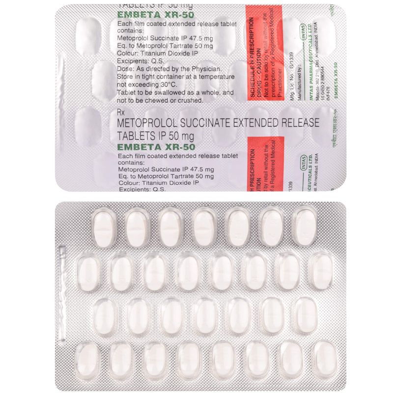 Embeta XR 50 Tablet contains Metoprolol Succinate (47.5mg), a beta-blocker used to treat high blood pressure (hypertension), angina (chest pain), and heart failure. It works by slowing down the heart rate and relaxing blood vessels, allowing the heart to pump blood more efficiently. This helps lower blood pressure and reduces the risk of heart attacks, strokes, and other heart-related complications.
