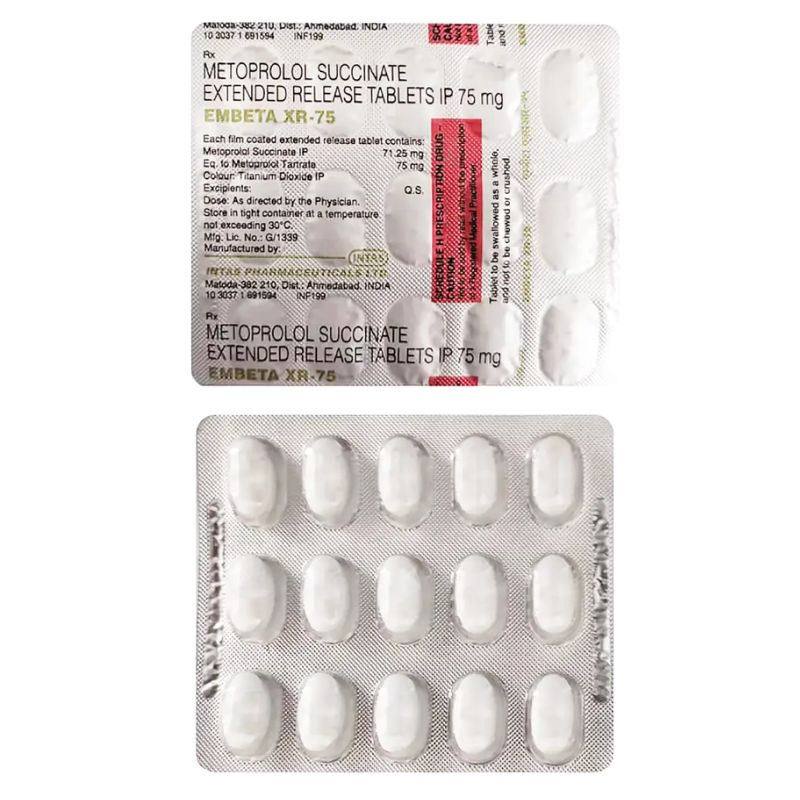 Embeta XR 75 Tablet contains Metoprolol Succinate (75mg), a beta-blocker that helps manage high blood pressure (hypertension), chest pain (angina), and heart failure. It works by reducing the heart rate, relaxing blood vessels, and improving blood flow throughout the body. This helps lower blood pressure and decreases the risk of heart attacks and strokes.
