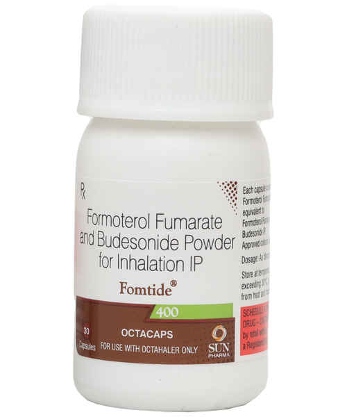 FOMtide 400 Octacaps is a prescription respiratory medicine containing Formoterol, a long-acting bronchodilator, and Budesonide, an inhaled corticosteroid. It is intended for the management of moderate to severe asthma and chronic obstructive pulmonary disease (COPD). Formoterol relaxes airway muscles to improve airflow, while Budesonide reduces airway inflammation, preventing asthma attacks and improving overall lung function.