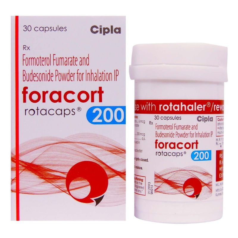 FORAcort 200 Rotacap, manufactured by Cipla Ltd, is a combination therapy that provides both immediate relief and long-term control of asthma and COPD symptoms. It contains Formoterol (6mcg) and Budesonide (200mcg) — two powerful agents that work synergistically to enhance breathing comfort and prevent exacerbations.