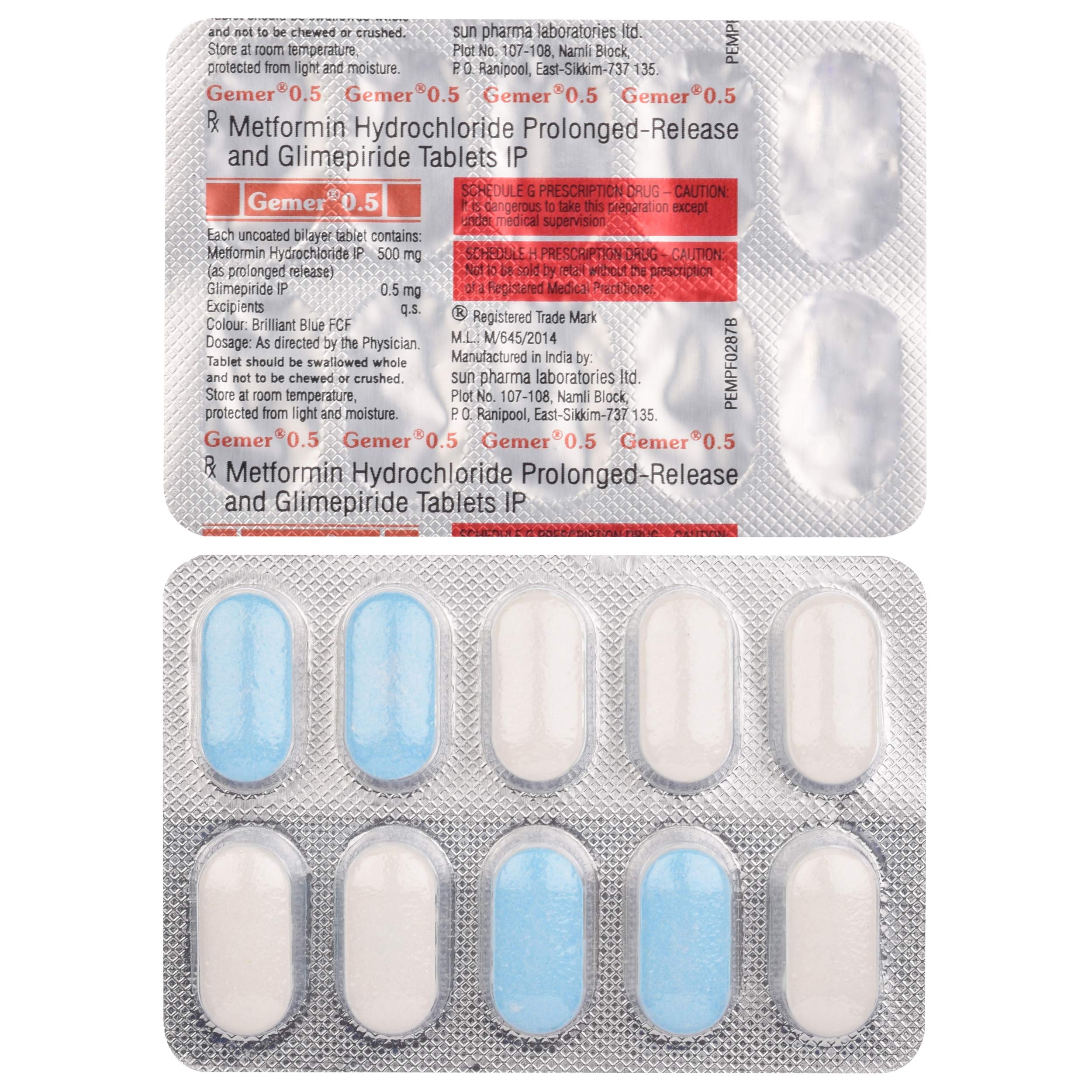 Gemer 0.5 Tablet PR is a prescription anti-diabetic medication combining Glimepiride, a sulfonylurea that stimulates insulin secretion, with Metformin, a biguanide that reduces glucose production in the liver. This combination is used for managing type 2 diabetes mellitus in patients whose blood sugar is not adequately controlled by diet, exercise, or single-drug therapy.