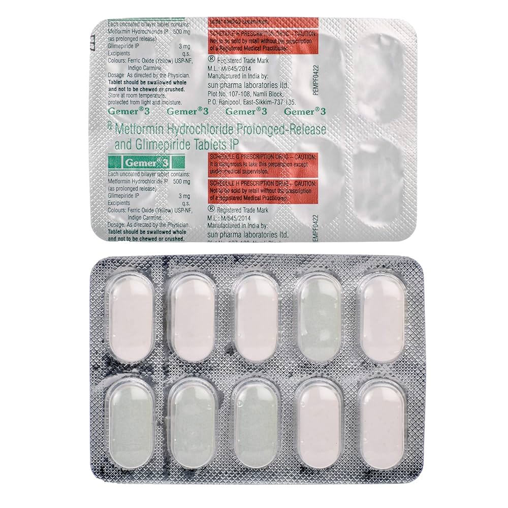 Gemer 3 Tablet PR is a prescription anti-diabetic medication combining Glimepiride, a sulfonylurea that stimulates insulin secretion, with Metformin, a biguanide that reduces glucose production in the liver. It is used for managing type 2 diabetes mellitus in patients whose blood sugar is not adequately controlled by diet, exercise, or monotherapy.