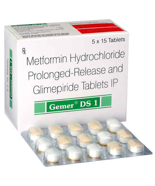 Gemer DS 1 Tablet PR is a prescription anti-diabetic medication combining Glimepiride, a sulfonylurea that stimulates insulin secretion, with a higher dose of Metformin (1000mg), a biguanide that decreases glucose production in the liver. This formulation is used for managing type 2 diabetes mellitus, particularly in patients who require a stronger dose of Metformin for better blood sugar control.