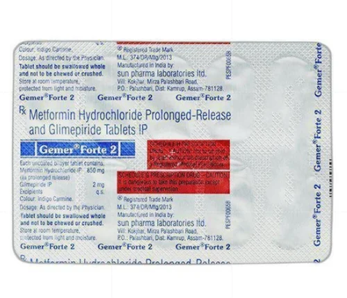 Gemer Forte 2 Tablet PR is a prescription anti-diabetic medication that combines Glimepiride, a sulfonylurea which stimulates insulin secretion, with Metformin (850mg), a biguanide that decreases glucose production in the liver. This formulation is used for managing type 2 diabetes mellitus, especially in patients who require an intermediate dose of Metformin along with Glimepiride for better glycemic control.