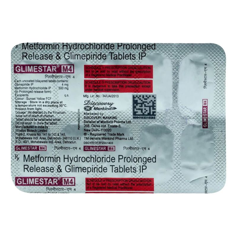 Glimestar M4 Tablet PR is a combination antidiabetic medicine used to control high blood sugar levels in people with type 2 diabetes mellitus. It contains Glimepiride, which helps the pancreas produce more insulin, and Metformin, which decreases glucose production in the liver and improves insulin sensitivity. The prolonged-release (PR) formula ensures a steady release of medicine for long-lasting blood sugar control.