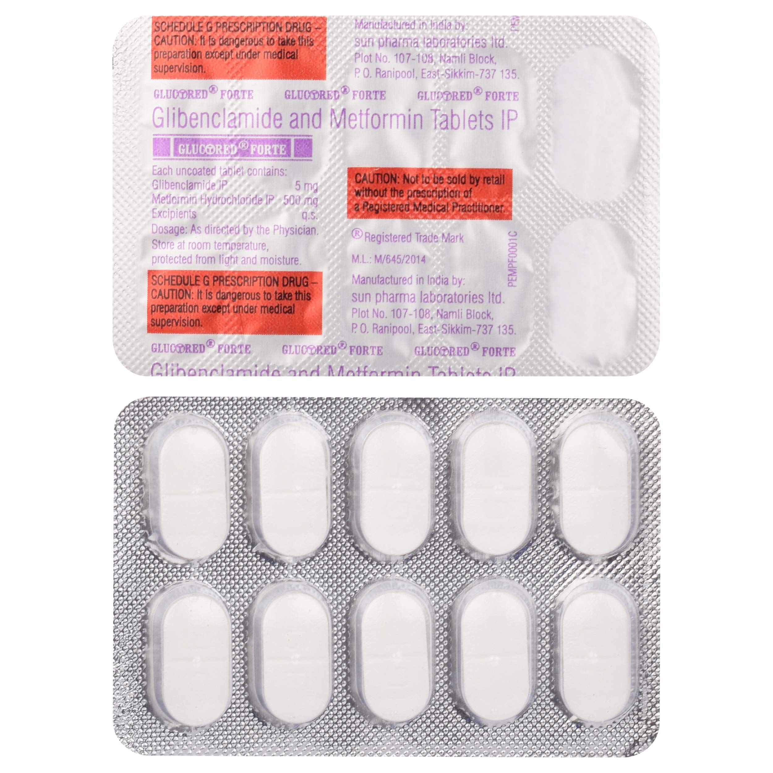 Glucored Forte Tablet is a prescription anti-diabetic medication that combines Glibenclamide, a sulfonylurea that stimulates insulin secretion, with Metformin (500mg), a biguanide that reduces glucose production in the liver. This combination is used for managing type 2 diabetes mellitus, particularly in patients who need higher doses for effective blood sugar control.