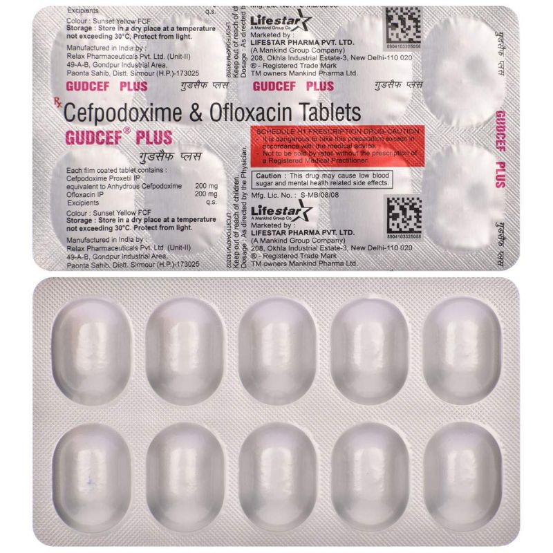 Gudcef Plus Tablet is a broad-spectrum antibiotic combination that contains Cefpodoxime Proxetil and Ofloxacin. Cefpodoxime is a cephalosporin antibiotic, while Ofloxacin is a fluoroquinolone antibiotic. Together, they work to kill a wide range of bacteria and prevent their growth. This combination is used to treat mixed bacterial infections affecting the lungs, urinary tract, throat, skin, and gastrointestinal system.