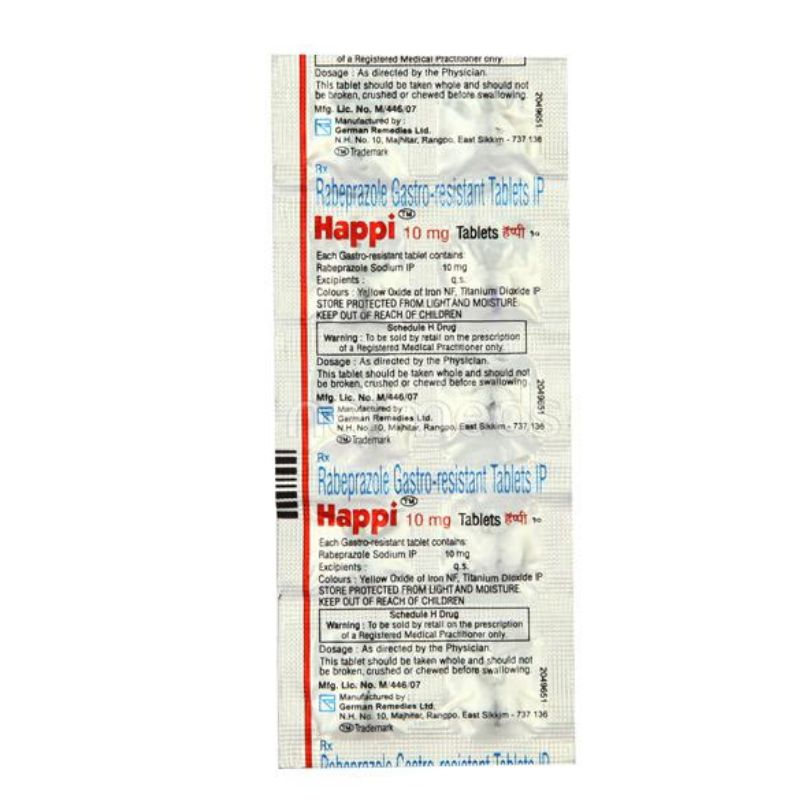 Happi 10mg Tablet contains Rabeprazole which belongs to a class of medicines known as proton pump inhibitors It works by reducing the amount of acid produced in the stomach helping to relieve acid related discomfort and allowing ulcers or inflammation to heal This medicine is commonly used to treat acid reflux heartburn gastroesophageal reflux disease and stomach or intestinal ulcers Happi 10mg Tablet provides quick and long lasting relief from burning sensation and discomfort caused by excessive acid in the stomach It helps improve digestion and supports recovery of the stomach lining