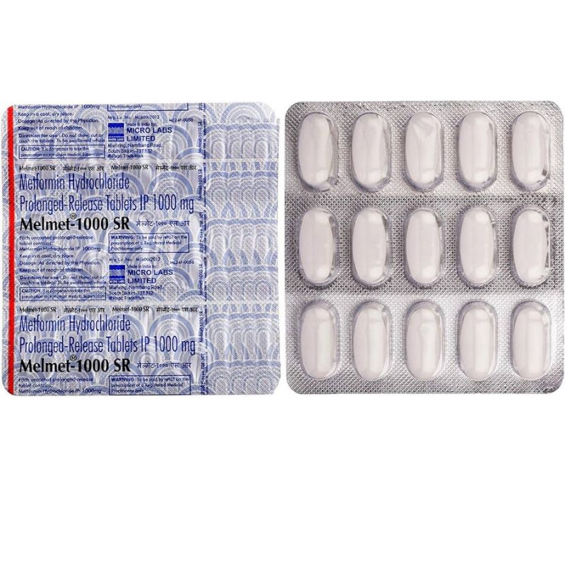 Melmet 1000 SR Tablet is used to manage high blood sugar levels in people with type 2 diabetes. The SR (sustained release) formulation helps maintain steady sugar control throughout the day and reduces stomach upset. It works by lowering glucose production in the liver, improving insulin sensitivity, and helping the body use insulin more effectively.