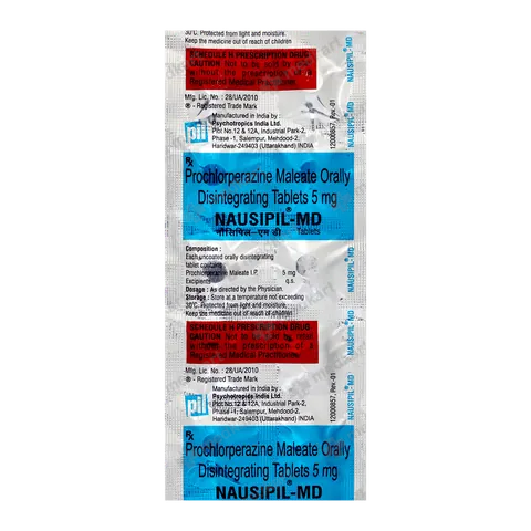 Nausipil MD Tablet is a medication used to prevent and treat nausea, vomiting, and dizziness. It contains Prochlorperazine (5mg), which belongs to the class of phenothiazine antiemetics. This medicine works by blocking dopamine receptors in the brain that trigger nausea and vomiting, providing effective relief from these symptoms.