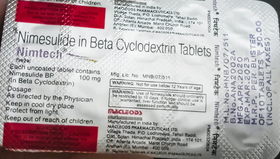 Take Nimtech 100mg Tablet with food to avoid stomach upset. Swallow whole with water; do not crush or chew. Always use the lowest effective dose for the shortest possible duration as advised by your doctor.