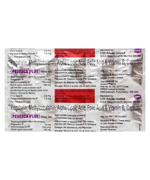 Pevesca Plus Capsule combines Alpha Lipoic Acid, Folic Acid, Methylcobalamin, Pregabalin, and Vitamin B6 to provide comprehensive nerve support. It is commonly prescribed for peripheral neuropathy caused by diabetes, chemotherapy, or nerve injury, addressing nerve damage, pain, and vitamin deficiencies simultaneously.