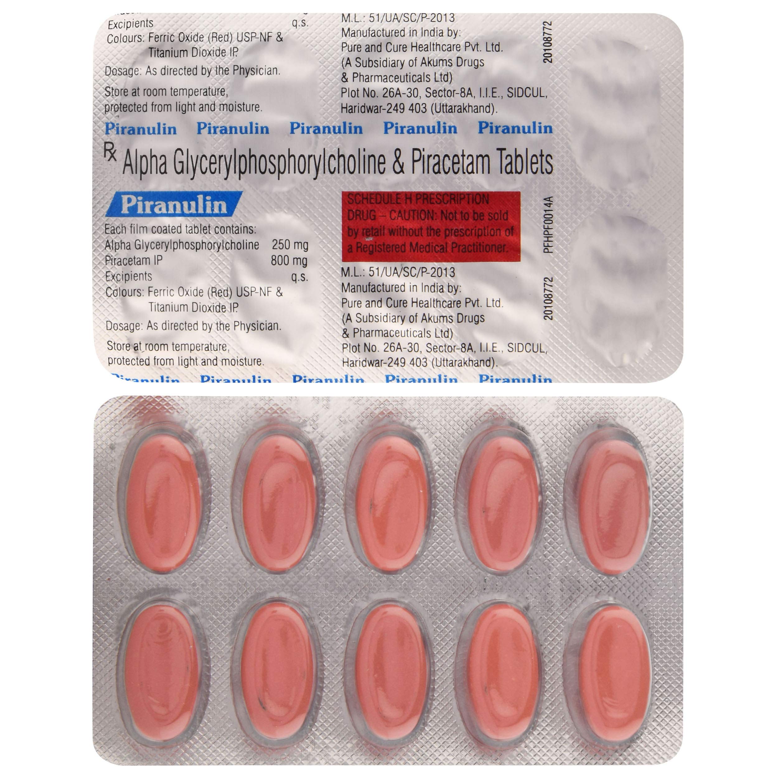 Piranulin Tablet is a combination medicine containing Alpha Glycerylphosphorylcholine (250mg) and Piracetam (800mg). It is used to improve cognitive function, memory, and brain performance, particularly in patients with age-related cognitive decline or neurological disorders.