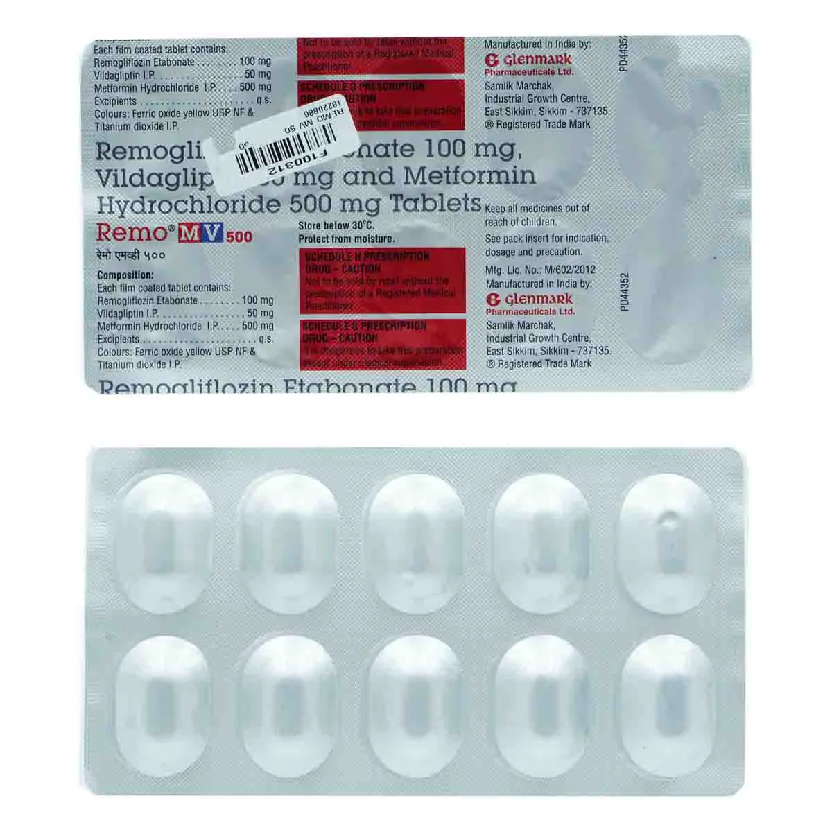 Remo MV 500 Tablet (Remogliflozin Etabonate 100 mg + Vildagliptin 50 mg + Metformin 500 mg) is a triple-action antidiabetic therapy that effectively lowers blood sugar, improves glycemic control, and supports weight management. When used under medical supervision with diet and lifestyle measures, it provides comprehensive management of type 2 diabetes and helps prevent long-term complications.