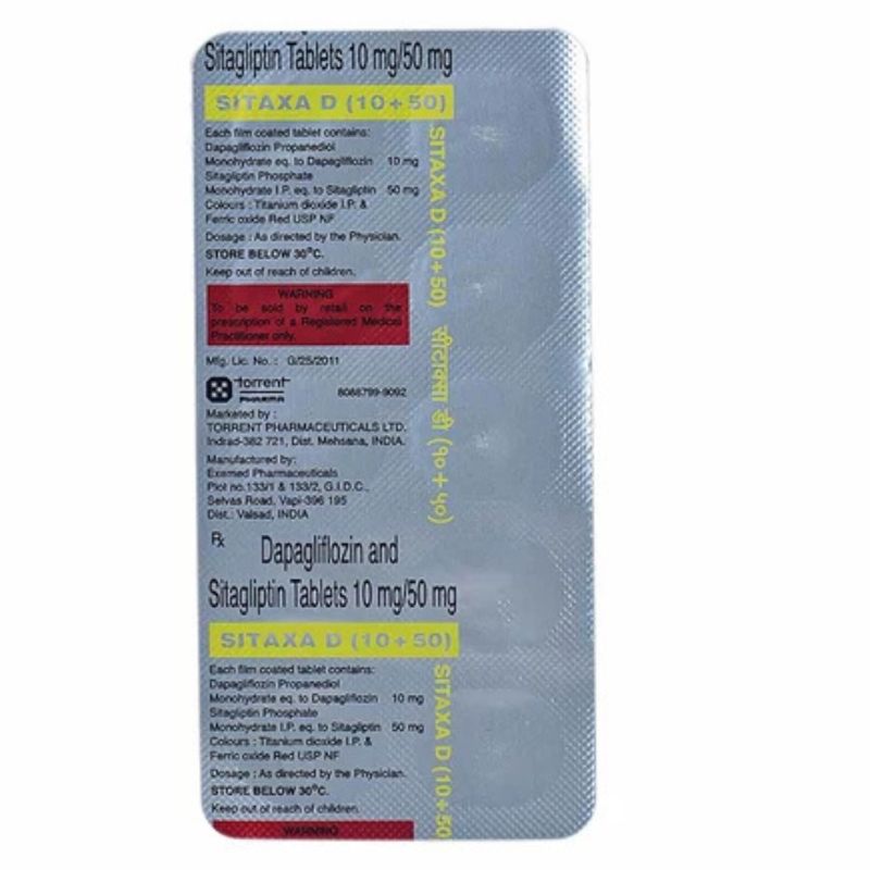 SitaXA D 10mg/50mg Tablet is a combination anti-diabetic medicine containing Dapagliflozin and Sitagliptin. Dapagliflozin is an SGLT2 inhibitor that reduces blood glucose by promoting glucose excretion through urine. Sitagliptin is a DPP-4 inhibitor that increases incretin hormone activity, stimulating insulin release and reducing post-meal glucose production.