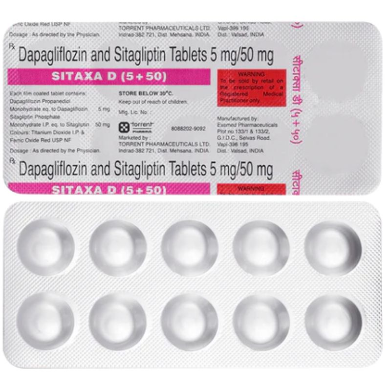 SitaXA D 50+5 Tablet is a combination anti-diabetic medication containing Dapagliflozin and Sitagliptin. Dapagliflozin is an SGLT2 inhibitor that helps lower blood sugar by increasing glucose excretion through urine. Sitagliptin is a DPP-4 inhibitor that enhances incretin hormone activity, increasing insulin secretion and reducing glucose production after meals.