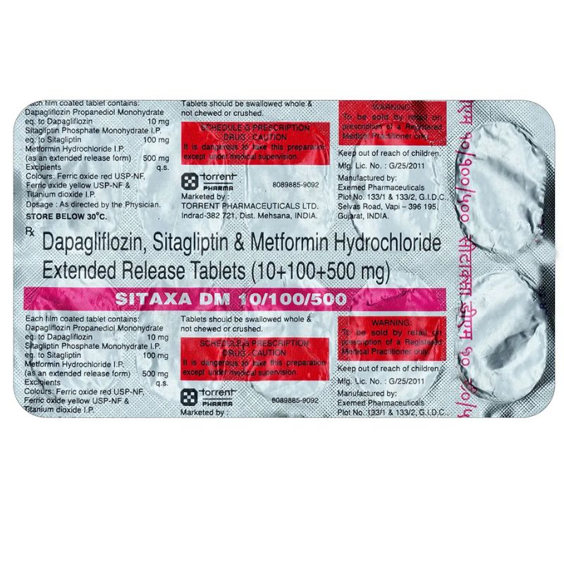 SitaXA DM 10/100/500 Tablet ER is an extended-release combination anti-diabetic medicine containing Dapagliflozin, Metformin, and Sitagliptin. Dapagliflozin (SGLT2 inhibitor) lowers blood sugar by promoting glucose excretion through urine. Metformin (biguanide) decreases liver glucose production and improves insulin sensitivity. Sitagliptin (DPP-4 inhibitor) enhances incretin hormone activity, increasing insulin secretion and reducing post-meal glucose production.