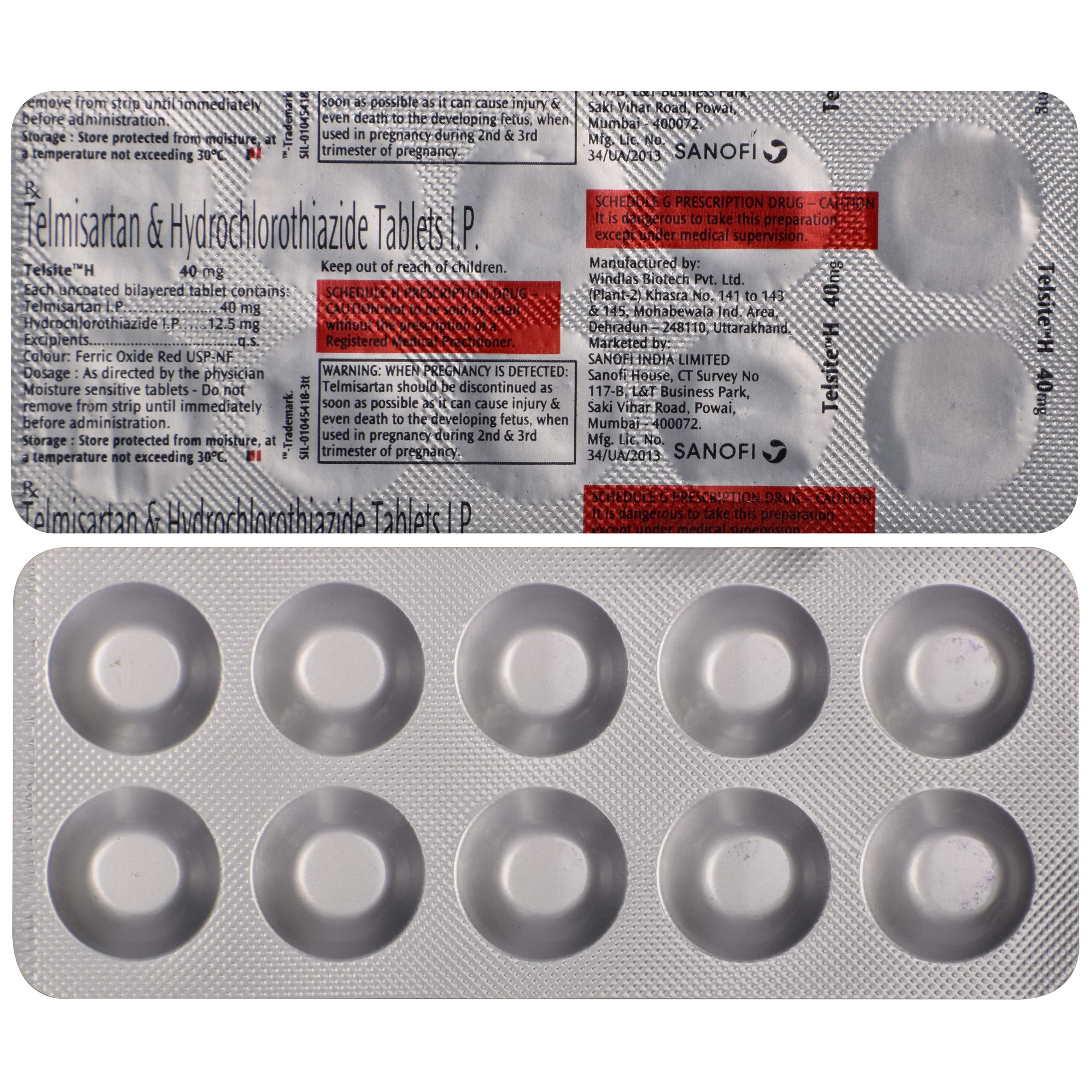 TelSite H 40mg Tablet is a prescription medicine manufactured by Emcure Pharmaceuticals Ltd. It contains a combination of Telmisartan (40mg), an angiotensin II receptor blocker (ARB), and Hydrochlorothiazide (12.5mg), a thiazide diuretic. This combination helps manage high blood pressure more effectively than either drug alone by relaxing blood vessels and reducing excess fluid in the body.
