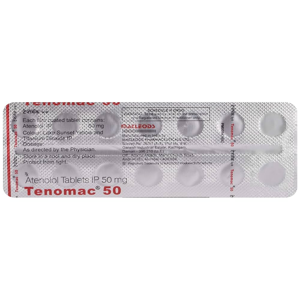 Tenomac 50 mg Tablet is a beta-blocker containing Atenolol, which works by slowing the heart rate and reducing cardiac workload. This helps lower blood pressure, manage angina, and prevent heart-related complications. It is an effective option for patients who need stronger control compared to lower doses.
